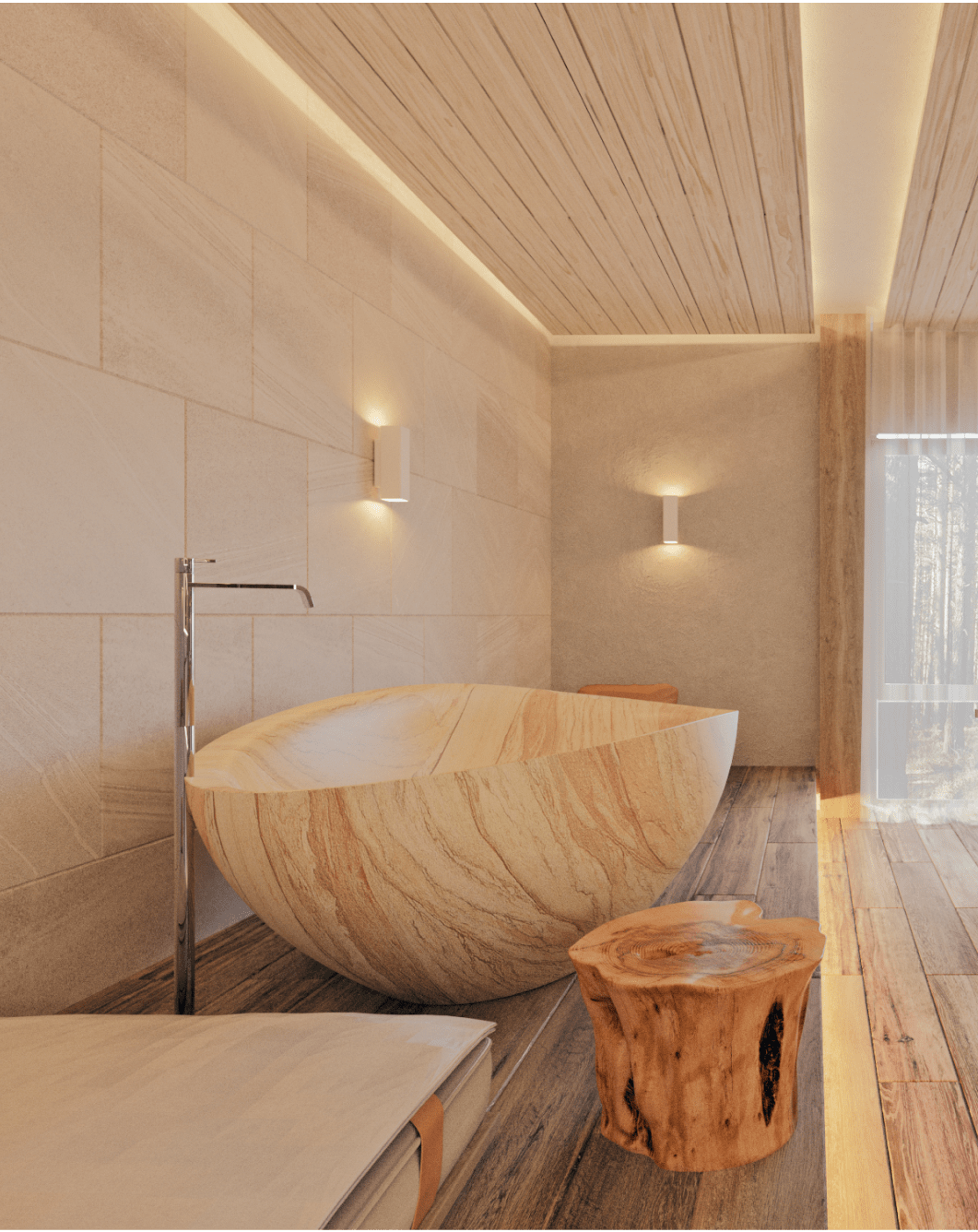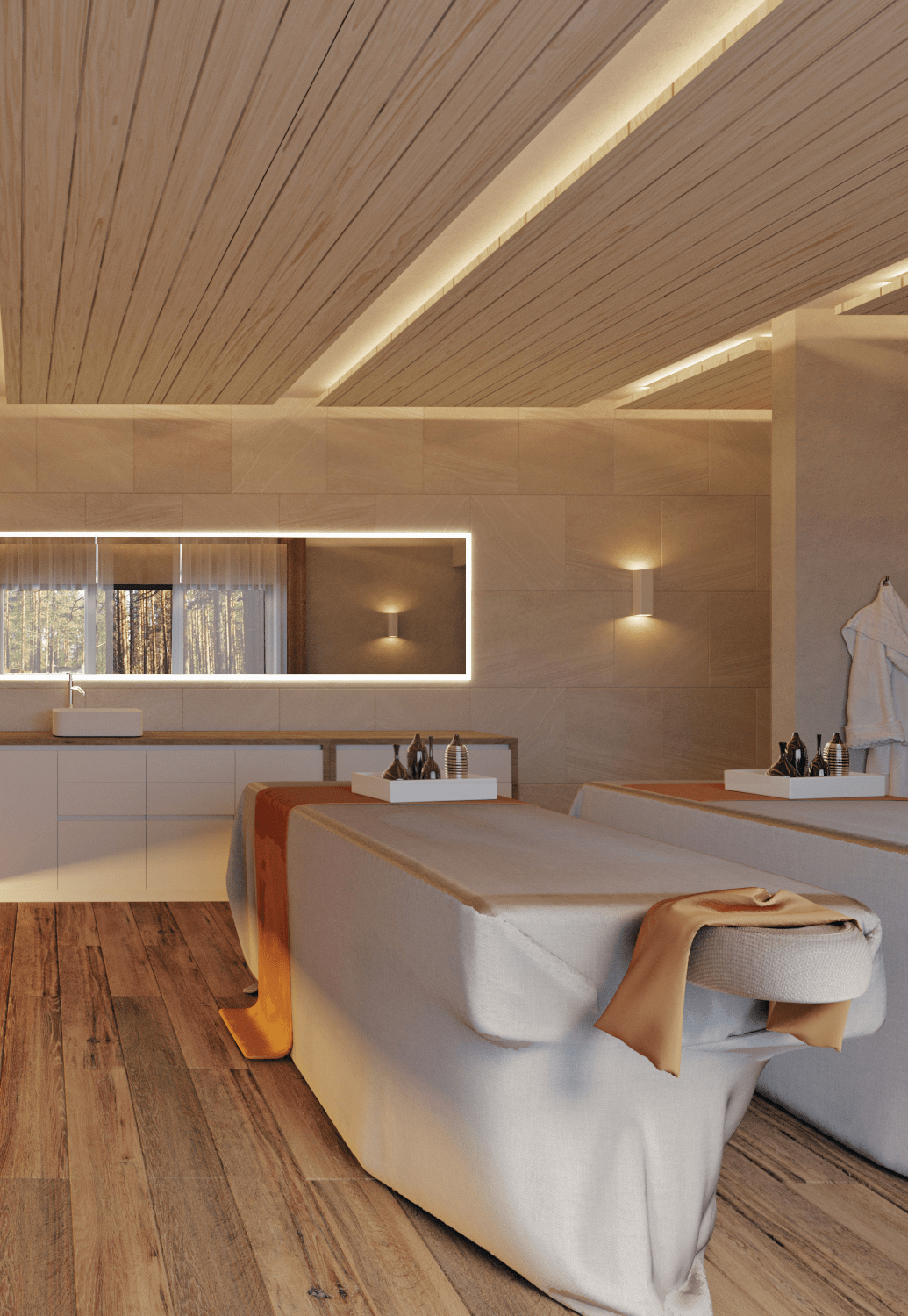 Для еще более глубокого соединения с природой доступна зона снаружи спа-комплекса: уличные чаши выплывных бассейнов, открытый всесезонный подогреваемый бассейн, 2 джакузи, русская парная и летняя терраса с шезлонгами под открытым небом.