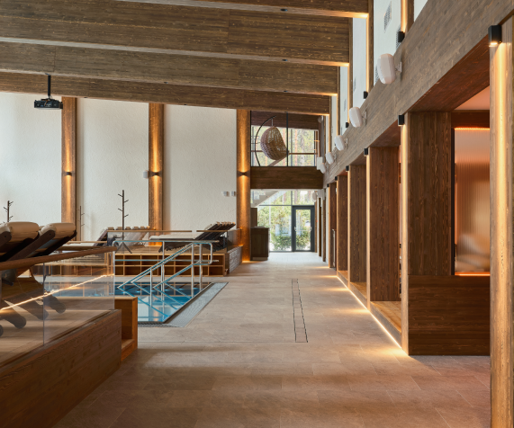 Термальная зона – это 2 крытых выплывных бассейна (с пресной и соленой водой), зона с шезлонгами, 2 сауны, 2 хаммама, купель, ледник, дорожка Кнейпа, душ впечатлений и комната тишины с камином и чайной станцией.